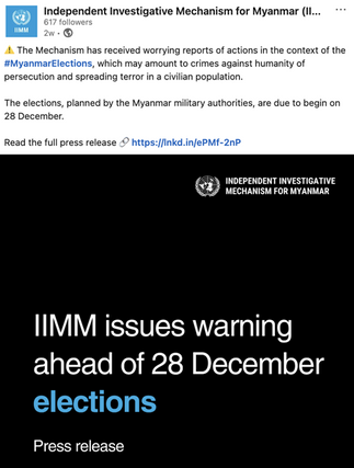 In the weeks leading up to the elections, the Office of the UN High Commissioner for Human Rights has documented new waves of acute insecurity and violence, ongoing arrests and detentions of opponents, voter coercion, the extensive use of electronic surveillance tools and systemic discrimination. UN High Commissioner for Human Rights Volker Türk warned, “I fear this process will only further deepen insecurity, fear and polarization.” Approximately 56 townships where martial law remains in force will be excluded from the elections, as the junta escalates its targeting of civilians in attempts to retake territory held by a range of ethnic resistance organizations (EROs). EROs – including the Arakan Army, which controls nearly all of Rakhine State – have also been accused of abuses against civilians that may amount to crimes against humanity and war crimes.